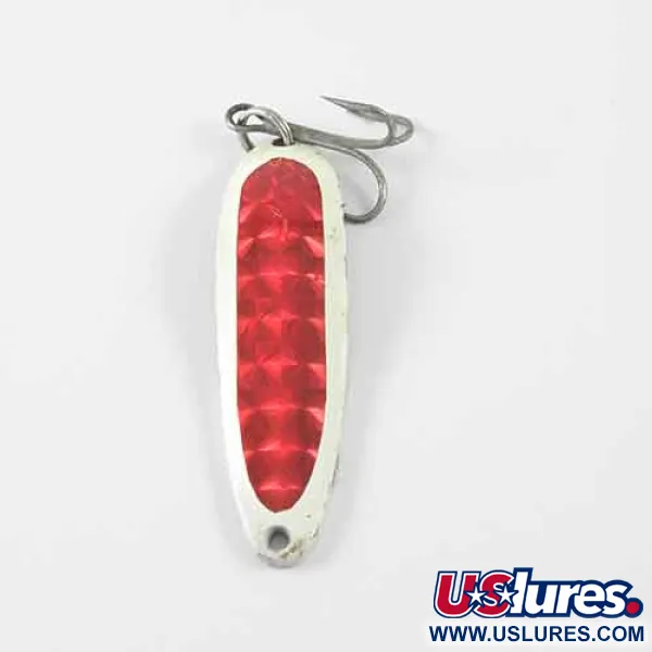 Un ruban adhésif texturé à écailles rouges crée un éclat saisissant sur le bord émaillé blanc de cette cuillère Eppinger classique. Mesurant 5,5 cm (2 1/4"), la Cop-E-Cat 7300 affiche un poids substantiel de 14 g (1/2 oz) conçu pour les lancers à longue distance ou la traîne. En retournant le leurre, on découvre une finition en nickel poli au verso, où le marquage « COP-E-CAT 7300 Eppinger U.S.A. » est directement estampillé dans le métal. Ce spécimen particulier conserve une note d'état de 4/5, présentant des pigments bien conservés et des surfaces propres sur l'ensemble. Le code produit 1380 identifie cette configuration de couleur spécifique dans le catalogue de l'entreprise basée au Michigan, qui produit du matériel de pêche depuis 1906. Un seul hameçon triple est fixé à l'extrémité par un anneau brisé, prêt à l'emploi en eau douce.