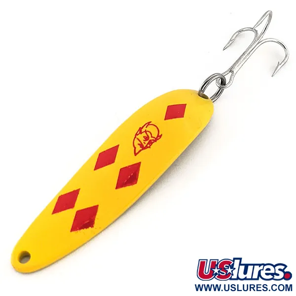 Cinq losanges rouges contrastent nettement avec l'émail jaune vif de cette cuillère ondulante classique. Le corps métallique révèle au dos une finition dorée soignée, estampillée 'COP-E-CAT 7400 DETROIT U.S.A.', lien direct avec l'héritage manufacturier d'Eppinger dans le Michigan. Ce spécimen, répertorié sous le code 12859, pèse 2/3 oz (19 g) et mesure 2 1/2" (6,5 cm). La face avant arbore l'emblématique logo du diable rouge centré dans le motif géométrique. En condition 5/5, la finition est exceptionnellement bien préservée, témoignant de la qualité des matrices exclusives de l'usine américaine. Un hameçon triple robuste de couleur argentée est fixé à l'arrière par un anneau brisé, complété par un œillet d'attache propre au nez effilé. Sa courbure concave profonde est conçue spécifiquement pour le lancer et la traîne.