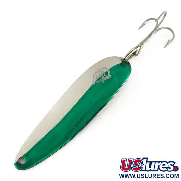 Une séparation diagonale frappante entre le nickel poli et le vert translucide définit l'attrait visuel de ce modèle. Pesant 14 g (1/2 oz), cette Eppinger Dardevle Cop-E-Cat 7400 est un représentant classique de l'héritage de la pêche à Détroit. Le dos de la cuillère affiche clairement les marquages estampillés « COP-E-CAT 7400 » et « DETROIT U.S.A. », ancrant son histoire aux racines originales de la marque dans le Michigan. Mesurant 6,5 cm (2 1/2"), le leurre arbore l'emblématique logo à tête de diable gravé sur le côté teinté de vert du métal. L'hameçon triple renforcé reste solidement fixé via un anneau brisé à l'arrière, ce qui le rend adapté au lancer comme à la traîne. Cet exemplaire spécifique, identifié par le code produit 8392, conserve une note d'état de 5/5, présentant les reflets brillants et les surfaces propres attendus d'un objet de collection bien préservé. La forme concave du corps est une signature de la philosophie de conception d'Eppinger, qui a débuté dans le sous-sol de Lou Eppinger en 1906.