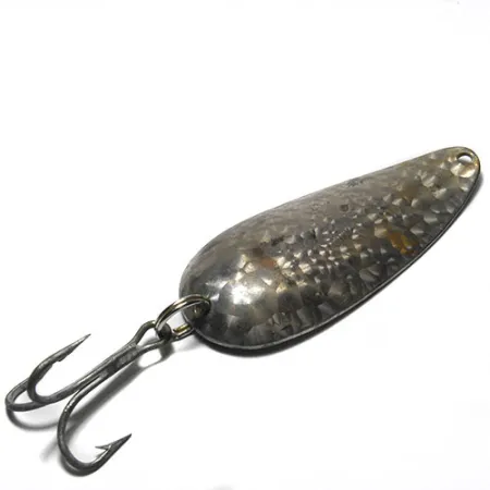 Une finition argentée martelée avec un motif d'écailles capte la lumière sur cette cuillère Eppinger de 3" (7,5 cm), un design produit avec des matrices exclusives depuis les débuts de l'entreprise dans le Michigan. Ce spécimen, portant le code produit 0305, est fini dans le coloris Crystal (Scale Silver), offrant une réflexion multidimensionnelle sur l'eau par rapport aux cuillères lisses standard. Le nom classique Dardevlet est clairement frappé dans le ventre concave du leurre, marquant son authenticité et son héritage américain. En condition 4/5, les surfaces métalliques restent brillantes et l'hameçon triple d'origine est solidement fixé via un anneau brisé robuste. La géométrie oblongue et la forme incurvée profonde sont conçues par Eppinger pour créer un mouvement oscillant distinct lors d'une récupération constante. Pour les eaux claires, ce dos nickelé et cette face écaillée constituent une présentation naturelle pour les poissons prédateurs. Le point d'attache à l'extrémité effilée présente une usure minimale, indiquant que ce leurre spécifique a été bien entretenu dans une boîte de collectionneur.