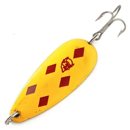 Pesant 21 g (3/4 oz), cette cuillère ondulante Eppinger arbore le motif emblématique Five of Diamonds, composé de cinq losanges rouge profond centrés sur un fond jaune vif. Ce modèle Dardevle Dardevlet, mesurant 7 cm (2 3/4"), reste un incontournable pour les passionnés de matériel de pêche fabriqué dans le Michigan. La face avant est ornée du logo classique à tête de diable rouge, tandis que le dos en laiton estampillé confirme sa fabrication à Dearborn, Michigan. Cet exemplaire, code produit 11970, est dans un état 5/5, présentant une finition propre et une peinture bien conservée qui souligne l'héritage des créations de Lou Eppinger. Sa forme oblongue spécifique et sa surface concave, obtenues grâce aux matrices exclusives du fabricant, sont essentielles pour les techniques de lancer traditionnelles. Elle est équipée de l'armement d'origine, incluant un hameçon triple piquant et des anneaux brisés robustes fixés par des œillets percés avec précision.