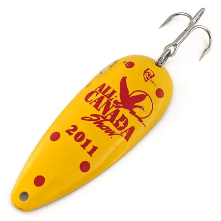 Une finition jaune vif avec des points rouges distinctifs et le logo « ALL CANADA Show 2011 » font de cet exemplaire une édition commémorative unique. Cette Eppinger Dardevle Dardevlet, répertoriée sous le code 13166, présente la forme classique en goutte d'eau que Lou Eppinger a rendue célèbre depuis son atelier de Détroit dès 1906. Pesant 21 g (3/4 oz) pour une longueur de 7 cm (2 3/4"), cette cuillère est parfaitement équilibrée pour le lancer ou la traîne. Le revers en nickel poli est frappé du poids et du nom « DARDEVLET ». Notée 5/5 pour son état, elle est impeccable, prête pour une collection ou une récupération lente le long des herbiers. La fabrication repose sur des matrices exclusives conservées aux USA, garantissant que le profil concave reste fidèle au design original. Pour le pêcheur en eaux claires, l'association du jaune vif et du nickel offre une visibilité optimale. L'armement se compose d'un hameçon triple piquant monté sur un anneau brisé robuste.