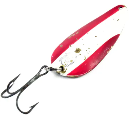 Pesant 21 g (3/4 oz), cette cuillère ondulante vintage possède la densité caractéristique d'une véritable légende du lancer. Mesurant 7 cm (2 3/4"), l'Eppinger Dardevle Dardevlet, code produit 3133, arbore le motif classique à rayures rouges et blanches sur sa face supérieure. Quelques petits éclats dans l'émail révèlent la base en laiton, ajoutant du caractère à ce leurre qui a manifestement fait partie de la sélection habituelle d'un pêcheur. Le verso présente les estampilles « DARDEVLET » et « DETROIT U.S.A. » frappées directement dans le laiton, un détail qui situe sa fabrication avant le déménagement de l'entreprise à Dearborn en 1959. Cet exemplaire, noté 4/5, conserve son hameçon triple d'origine et demeure un exemple probant des formes découpées exclusives popularisées par Lou Eppinger dans le Michigan. Sa face concave et sa conception lourde la rendent tout aussi adaptée aux lancers à longue distance qu'à la pêche à la traîne profonde.