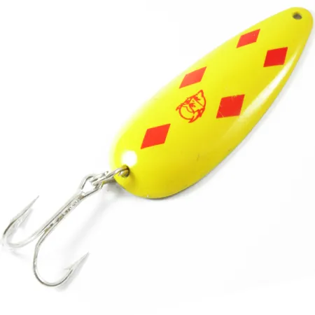 Une finition émaillée jaune vif identifie instantanément le motif classique « Five of Diamonds » sur ce spécimen. Pesant 21 g (3/4 oz) et mesurant 7 cm (2 3/4"), ce Dardevle Dardevlet porte le code produit 3449. La face convexe présente cinq losanges rouges nets flanquant le célèbre logo à tête de diable rouge, tandis que le dos présente une surface en laiton poli avec « DARDEVLE » et « MADE IN USA » clairement estampillés dans le métal. La forme concave est une marque de fabrique de la production d'Eppinger basée au Michigan, conçue pour créer une action oscillante spécifique lors d'une récupération lente. Ce leurre particulier est dans un état 5/5, paraissant inutilisé avec son hameçon triple fini nickel et son anneau brisé d'origine intacts. Depuis 1906, Eppinger utilise des matrices exclusives pour maintenir ces dimensions spécifiques, un niveau de qualité qui a autrefois fait de ces cuillères un équipement standard dans les kits de survie de l'aviation militaire. Le contraste entre la face jaune vif et le dos en laiton métallique fournit l'éclat visuel nécessaire pour le brochet et d'autres espèces prédatrices.
