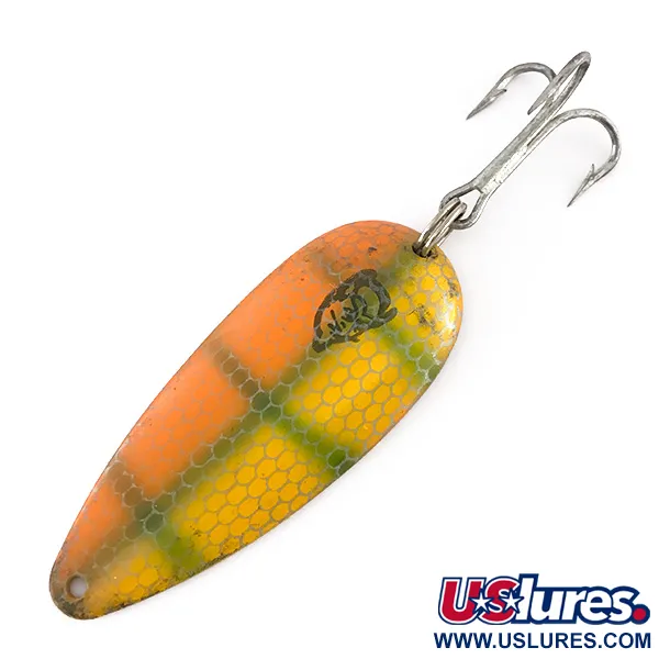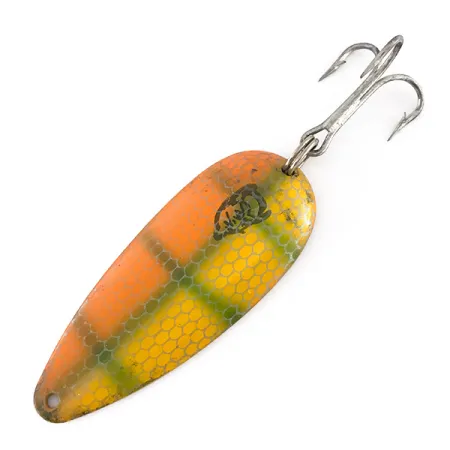 Le nickelage poli capture la lumière au revers de cette cuillère ondulante de 21g (3/4oz), arborant les estampilles distinctes « DARDEVLET » et « DEARBORN MI » recherchées par les collectionneurs. Mesurant 7 cm (2 3/4"), la face de ce leurre présente une combinaison frappante de teintes orange et vertes disposées en motif croisé. Un fin revêtement en nid d'abeille ajoute une texture scintillante à la surface peinte, où le célèbre logo à tête de diable noir reste parfaitement net. Identifiée par le code produit 8412, la forme de la cuillère repose sur les matrices exclusives d'Eppinger, assurant la profondeur concave nécessaire à sa nage oscillante emblématique. L'armement est en excellent état, avec un anneau brisé solide et un hameçon triple brillant. Sorti de l'usine de Dearborn, devenue le siège de la marque en 1959, ce modèle est un excellent exemple de l'histoire de la pêche américaine. Son état est noté 5/5, témoignant de la qualité classique de fabrication du Michigan.