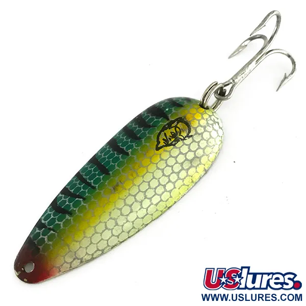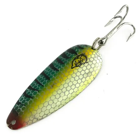 Le nom « DARDEVLET » ainsi que son origine « DEARBORN MI » et son poids de « 3/4 OZ. » sont clairement estampillés sur le revers de couleur laiton. Cette cuillère de 21 g (3/4 oz) arbore le motif distinctif Perche, réalisé avec une texture en nid d'abeille semblable à des écailles sur un dégradé jaune et vert éclatant. Des barres verticales sombres apportent un contraste réaliste, complétées par un subtil accent rouge à la pointe près de l'attache. La face avant affiche bien en évidence le logo iconique de tête de diable noir, signature de la marque Eppinger depuis sa fondation en 1906. Mesurant 7 cm (2 3/4"), l'armement du leurre se compose d'un hameçon triple robuste fixé via un anneau brisé à l'arrière. Ce spécimen, identifié par le code produit 8442, reste dans un état exceptionnel, obtenant une note de 5/5 pour ses surfaces propres et ses marquages nets. Depuis qu'Eppinger a transféré sa production à Dearborn en 1959, ce leurre constitue une pièce emblématique de l'histoire du matériel de pêche du Michigan. Sa fabrication en laiton massif et son profil lesté sont conçus pour le lancer et la traîne dans diverses conditions d'eau.