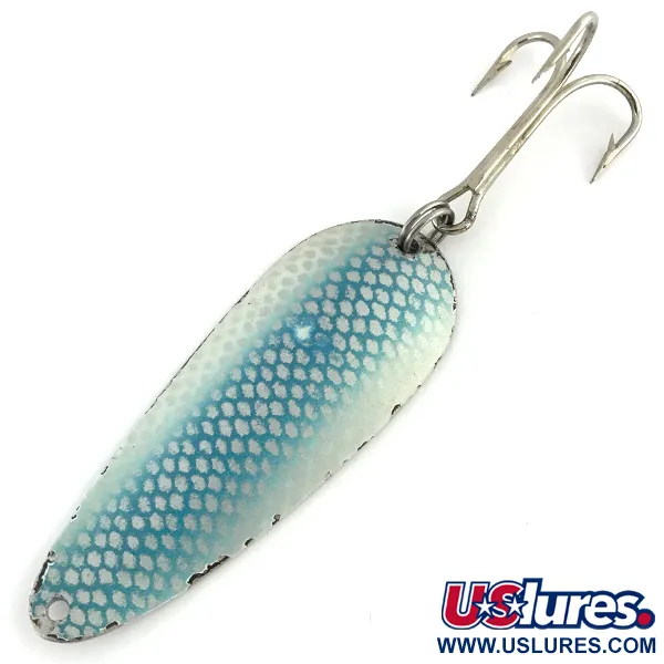 Un motif de maillage à écailles bleues se détache sur la finition blanche de cette cuillère ondulante classique. Gravé sur le revers en nickel poli, le nom "DARDEVLET" ainsi que "DETROIT U.S.A." marquent son héritage de la première ère de production d'Eppinger. Avec un poids de 21 g (3/4 oz) et une longueur de 7 cm (2 3/4"), ce spécimen, identifié par le code produit 8722, représente un poids classique pour le lancer longue distance ou la traîne profonde. La face avant présente une texture d'écailles distincte créée par une pulvérisation bleue sur une base blanche, offrant une visibilité à haut contraste. Ce leurre possède son armement d'origine, incluant un hameçon triple robuste attaché via un anneau brisé à l'arrière. Avec une note d'état de 4/5, la cuillère affiche son âge avec grâce, présentant des surfaces propres et un revers métallique brillant. Elle reste une pièce fonctionnelle du savoir-faire de Detroit issue de la légendaire gamme Eppinger.