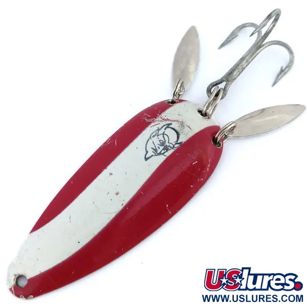 Mesurant 7 cm (2 3/4"), le corps oblong de cette cuillère ondulante arbore le légendaire motif à rayures rouges et blanches à haut contraste. Cet outil de lancer de 21 g (3/4 oz), répertorié sous le code produit 11062, présente le logo distinctif de la tête de diable noire estampillé directement sur la rayure blanche centrale. Ce qui rend l'Eppinger Dardevle Dardevlet Klicker unique est l'ajout de deux palettes sonores en nickel en forme de larme fixées à l'anneau brisé arrière. Ces palettes sont conçues pour cliquer contre la cuillère et entre elles lors de la récupération, ajoutant un élément sonore mécanique à l'éclat visuel. Le revers du leurre présente une finition en nickel poli où la marque du fabricant est frappée dans le métal. Dans l'ensemble, l'exemplaire est en bon état, ne montrant que de légères rayures de surface et des éclats de peinture mineurs, correspondant à une évaluation de condition 4/5. L'armement reste robuste, avec un hameçon triple standard de couleur argentée prêt pour l'eau ou le panneau d'exposition. Les designs de Lou Eppinger, nés au Michigan, sont restés largement inchangés depuis des décennies, s'appuyant sur cette géométrie concave spécifique pour capter la lumière.