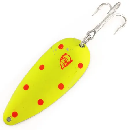 Mesurant 7 cm (2 3/4 pouces), cette cuillère arbore une finition Chartreuse haute visibilité avec des points roses sur une base en nickel poli. Ce modèle Dardevlet, identifié par le code produit 12410, pèse 21 g (3/4 oz) et présente le poinçon emblématique de la tête de diable rouge, un hommage aux débuts de la marque à Detroit sous Lou Eppinger en 1906. Conçue comme une variante fluorescente UV Glow, la peinture spécialisée offre une luminescence verte vive dans les environnements à faible luminosité, en faisant un choix technique pour les applications en eau profonde. Le leurre est équipé d'un hameçon triple piquant et d'un anneau brisé robuste, présentant tous deux une usure minimale. Dans son état actuel de 5/5, la peinture est exceptionnellement propre et le placage en nickel au revers reste brillant. Eppinger utilise des matrices exclusives spécifiques pour créer la forme oblongue signature du métal, ce qui permet des distances de lancer substantielles même par temps venteux.