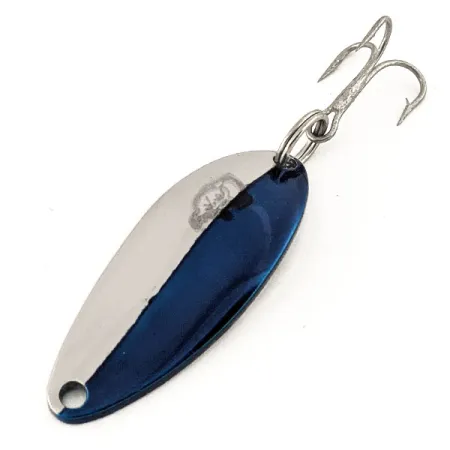 Un fini bicolore Nickel / Bleu éclatant définit la face de ce Dardevle Devle Dog 5200 vintage, captant la lumière exactement comme Lou Eppinger l'avait imaginé. Mesurant 1 1/2" (4 cm) de long, cette cuillère présente le corps oblong concave emblématique qui a fait de la marque un incontournable depuis ses débuts à Détroit en 1906. Ce leurre spécifique, code produit 12652, pèse 1/4oz (7g) et porte l'adresse de Dearborn, MI estampillée au dos, indiquant sa fabrication après le déménagement de l'entreprise en 1959. Le revers reste propre et brillant, affichant clairement le nom du modèle et le lieu de fabrication, tandis que l'armement se compose d'un anneau brisé robuste et d'un hameçon triple argenté d'origine. Ce spécimen est inutilisé, apparaissant aussi frais et bien conservé que s'il venait d'être sorti de sa carte d'origine. Conçue pour le lancer ou la traîne, l'épaisseur du métal garantit qu'elle conserve sa profondeur même lors d'une récupération plus lente.