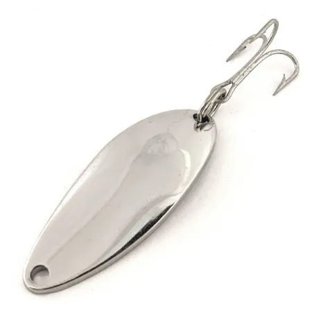 Portant clairement l'inscription « DEVLE-DOG 5200 DETROIT USA » sur sa face concave, cette cuillère ondulante nickelée représente un chapitre classique de l'histoire de fabrication d'Eppinger. Mesurant 4 cm (1 1/2") pour un poids de 7 g (1/4 oz), elle offre un profil compact pour le lancer ou la traîne. La finition Nickel polie a été choisie pour ses reflets haute visibilité, ce qui en fait une option fiable en eaux claires où elle imite l'apparence naturelle de petits poissons fourrages. Ce spécimen, portant le code produit 12822, est équipé d'un hameçon triple et d'un anneau brisé qui illustrent la robustesse établie par Eppinger à Détroit dès 1906. Son état est évalué à 5/5, les surfaces métalliques étant propres et sans usure notable. Le marquage indique qu'elle provient de l'époque précédant le transfert de l'entreprise à Dearborn en 1959, soulignant son lien historique avec les premiers succès de la marque.