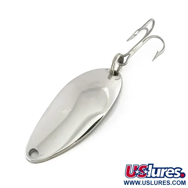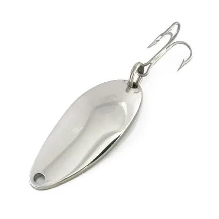 Le marquage "DEVLE-DOG 5200 DETROIT U.S.A." est nettement frappé dans le métal poli, identifiant ce classique de l'histoire de la pêche américaine de chez Eppinger. Cette cuiller de 4 cm (1 1/2") présente une finition nickel à haute brillance, souvent choisie par les pêcheurs expérimentés pour son flash maximal en eaux claires. Pesant 7 g (1/4 oz), ce modèle portant le code 8150 offre un profil polyvalent qui se lance facilement avec un matériel léger à moyen. Sa conception repose sur les matrices exclusives utilisées par Eppinger depuis les débuts de la marque à Détroit, garantissant la géométrie spécifique qui remplit les boîtes à pêche depuis des générations. Elle est équipée d'un hameçon triple piquant et d'un anneau brisé solide. Cet exemplaire est en excellent état, noté 5/5, affichant une surface miroir et un armement bien conservé. Avec une telle cuiller, une récupération linéaire est la norme, bien que certains pêcheurs obtiennent d'excellents résultats en imprimant de légers coups de scion pour faire papilloter le leurre à la pause.
