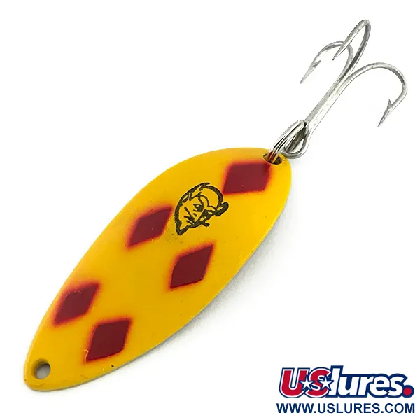 Les mots « DEVLE DOG 5400 » et « DETROIT U.S.A. » sont gravés au dos en laiton poli de ce modèle, un clin d'œil évident aux racines de Eppinger Manufacturing dans le Michigan. Mesurant 5,5 cm (2 1/4") et pesant 14 g (1/2 oz), cette cuillère arbore le motif emblématique Five of Diamonds : cinq losanges rouges distincts placés avec précision sur une finition jaune éclatante. Le logo classique à tête de diable noir est imprimé avec netteté sur la face, marque de fabrique de l'enseigne créée par Lou Eppinger en 1906. Cet article vintage, répertorié sous le code produit 8724, est neuf et conserve son lustre d'origine ainsi que sa peinture nette. La structure comprend un hameçon triple robuste de couleur argentée fixé par un anneau brisé à l'arrière et une attache pour la ligne percée à la tête. Sa forme oblongue concave est le résultat des matrices exclusives utilisées dans le processus de fabrication basé aux États-Unis, spécifiquement conçues pour le lancer ou la traîne.