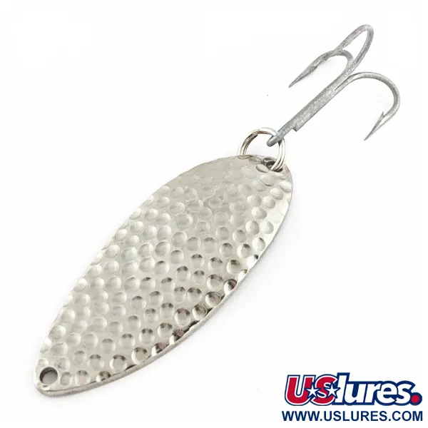 Une finition nickel martelé reflète intensément la lumière sur la surface texturée de cette cuillère lourde de 21 g (3/4 oz). Mesurant 6,5 cm (2 1/2"), la Dardevle Devle Dog 5500 Detroit (années 1980) est une pièce robuste de l'histoire de la pêche du Michigan, répertoriée sous le code produit 24271. Les collectionneurs apprécieront l'estampillage Detroit, un hommage à l'atelier d'origine de Lou Eppinger et à l'héritage de fabrication de longue date de la marque aux États-Unis. Ce spécimen est remarquablement bien conservé, affichant un état de 5/5 sans usure apparente sur le placage ni sur l'hameçon triple d'origine de couleur argentée. Le métal de forte épaisseur de la cuillère est associé à un anneau brisé solide, ce qui en fait un choix fiable pour les lancers à longue distance. Elle demeure un exemple parfait du matériel du milieu des années 80, dotée d'un point d'attache propre à l'avant et du profil classique en forme de goutte d'eau qui est resté un incontournable des boîtes de pêche depuis des décennies.