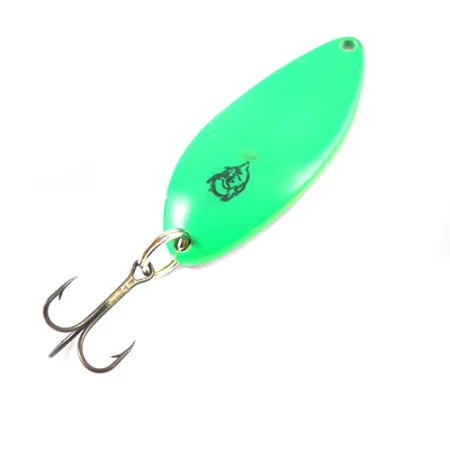 Une peinture verte vive recouvre la face convexe de cette cuiller ondulante classique, ornée du logo emblématique à tête de diable noir. Pesant 21 g (3/4 oz) pour une longueur de 6,5 cm (2 1/2"), cette Dardevle Devle Dog 7800 (Code 1803) est un incontournable de la gamme Eppinger. Le revers présente une finition en nickel poli avec l'estampille 'DEVLE-DOG 7800 DETROIT U.S.A.' bien visible, rappelant les racines historiques de la marque à Détroit avant son déménagement en 1959. Cet exemplaire affiche un état de 4/5, avec un armement bien conservé et une finition impeccable. L'équipement se compose d'un anneau brisé robuste et d'un hameçon triple affûté à finition bronze. Bien qu'Eppinger soit célèbre pour ses rayures rouges et blanches traditionnelles, cette variante verte offre un profil visuel distinct pour des conditions d'eau spécifiques. La forme oblongue et le ventre concave sont fabriqués avec précision à l'aide de matrices exclusives, une technique mise au point par Lou Eppinger pour garantir une qualité constante depuis 1906. Cette cuiller est destinée au lancer-ramener, s'appuyant sur son corps lesté pour atteindre de grandes distances et sur son profil incurvé pour créer son mouvement latéral caractéristique.