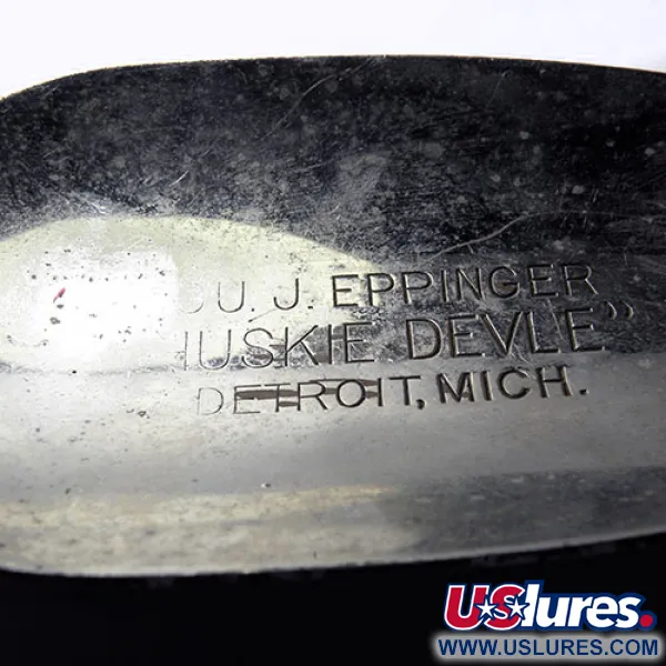 Pesant pas moins de 3 1/4 oz (91 g), cette cuillère ondulante robuste est conçue pour le lancer en eau profonde ou la traîne pour les prédateurs trophées. Ce modèle Eppinger, connu sous le nom de Huskie Devle (code produit 0245), mesure une longueur substantielle de 5 1/2" (14 cm). La finition classique Rouge / Blanc à l'avant est rehaussée par une texture distinctive en nid d'abeille recouvrant les sections blanches. Au dos, on découvre la face en chrome estampé, clairement marquée du nom « EPPINGER HUSKIE DEVLE » et de son origine « DEARBORN, MICH. », ce qui permet de dater ce modèle après le déménagement de l'entreprise en 1959. Une caractéristique unique de ce modèle spécifique est la petite palette vibrante peinte en jaune fixée à l'anneau brisé arrière, décorée de diamants rouges et du logo emblématique à tête de diable. L'armement est robuste, avec un grand hameçon triple à finition argentée prêt pour un service intensif. En état 4/5, la peinture reste éclatante et le métal conserve un brillant de haute qualité, témoignant du savoir-faire américain durable de l'époque. Les détails estampés au verso restent nets et lisibles sur la surface polie.