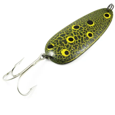 Estampillée sur le dos en nickel poli, la marque Lou J. Eppinger Mfg. Co. de l'époque de Detroit, Michigan, ancre fermement cette pièce dans l'héritage précoce de la marque. Ce Dardevle Huskie Junior, code produit 3233, pèse un poids substantiel de 2 oz (58g) et mesure 4 1/2" (11,5 cm), ce qui en fait un choix lourd destiné au lancer profond ou à la traîne. Le dessus présente une finition craquelée complexe vert et jaune, ponctuée de sept points noirs distincts cerclés de jaune qui créent un profil visuel contrasté. L'armement comprend un anneau brisé renforcé au niveau de l'attache et un hameçon triple robuste à large ouverture qui reste structurellement sain. La surface peinte et le revers métallique sont bien conservés et propres, reflétant une note d'état de 4/5. S'agissant du modèle Huskie Junior, il utilise la silhouette classique à profil large qu'Eppinger a standardisée il y a plus d'un siècle. L'estampille sur la face concave est profonde et lisible, soulignant le savoir-faire de l'usine originale de Detroit.