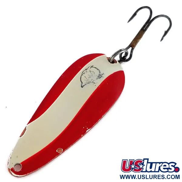 Clairement estampillé sur le revers cuivré, le poinçon « DARDEVLE IMP U.S.A. » identifie ce leurre comme une création authentique d'Eppinger. Ce spécimen particulier, portant le code produit 9799, présente le motif classique à rayures émaillées rouges et blanches sur sa face avant, accompagné de l'emblématique logo à tête de diable. Mesurant 5,5 cm (2 1/4") et pesant 11 g (2/5 oz), l'état de la cuillère est de 4/5, montrant une usure authentique de la peinture et de petits éclats près des bords et de l'œillet. La base en cuivre épais fournit le poids nécessaire au lancer, tandis que l'arrière est équipé d'un triple robuste fixé par un anneau brisé. Fabriqué historiquement par la société basée dans le Michigan fondée par Lou Eppinger en 1906, le modèle Imp reflète le design du milieu du siècle qui a vu ces leurres inclus dans les kits de survie de l'aviation. De petites zones de métal exposé sur la face rouge et blanche montrent le vieillissement de l'émail, tandis que le dos en cuivre reste propre et bien conservé.