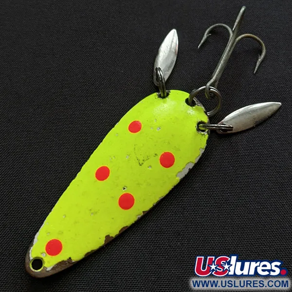 Le marquage sur le dos en nickel poli identifie clairement cette cuillère comme une authentique Eppinger Dardevle Imp U.S.A., une taille incontournable dans les boîtes à pêche depuis les débuts de l'entreprise à Detroit. Cette cuillère de 11 g (2/5 oz) arbore le coloris haute visibilité Clown, caractérisé par une base jaune-vert vif ponctuée de cinq points rouges distincts. Mesurant 5,5 cm (2 1/4"), ce modèle spécifique est la variante « Klicker », équipée de deux petites palettes argentées fixées à l'anneau brisé arrière, aux côtés de l'hameçon triple. Ces palettes métalliques produisent des reflets supplémentaires et un cliquetis distinct lorsqu'elles entrent en contact avec le corps concave. La peinture présente une légère usure avec quelques petits éclats sur les bords extérieurs, tandis que la finition principale reste éclatante, ce qui lui vaut une note d'état de 4/5. Le processus de fabrication utilise les matrices exclusives d'Eppinger, garantissant la courbure exacte requise pour le lancer et la traîne. Cette pièce, identifiée par le code produit 20333, témoigne du savoir-faire traditionnel que Lou Eppinger privilégiait lorsqu'il a commencé à fabriquer des leurres à la main dans son sous-sol il y a plus d'un siècle.