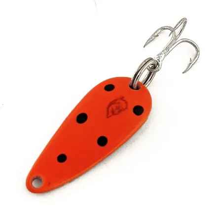 Des points noirs audacieux contrastent avec la surface orange-rouge fluorescente de cette cuiller de 3 cm. Estampée du logo emblématique à tête de diable, cette Eppinger Dardevle Lildevle UV porte le code 12820. Le dos en nickel génère un flash secondaire, tandis que la peinture spécialisée offre une luminescence significative sous la lumière UV — une touche moderne sur un héritage du Michigan remontant aux designs originaux de Lou Eppinger de 1906. À 3,4 g (1/8 oz), elle offre une densité suffisante pour des lancers précis vers les structures ou les bancs de poissons. L'armement comprend un anneau brisé robuste et un hameçon triple argenté piquant, tous deux en excellent état avec une note de 5/5. Les matrices exclusives d'Eppinger confèrent à cette cuiller son profil concave caractéristique, soigneusement maintenu depuis le déménagement de l'entreprise à Dearborn en 1959. Sa taille compacte et sa finition haute visibilité en font un choix fiable pour la truite ou les poissons de roche dans diverses conditions d'eau.