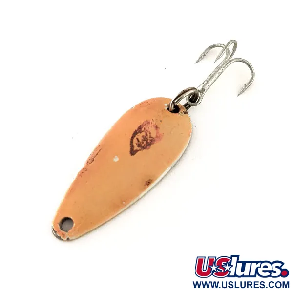 Gravé clairement sur le revers aux tons nickelés, on peut lire « DARDEVLE MIDGET U.S.A. », identifiant cette cuillère classique Eppinger. Mesurant 3,5 cm (1 1/2"), l'avant du leurre est fini dans une peinture Salmon chaleureuse, arborant l'incontournable logo de tête de diable noir centré sur le corps concave. Ce spécimen de 6 g (3/16 oz), identifié par le code produit 11724, conserve son armement d'origine, incluant un anneau brisé robuste et un hameçon triple tranchant à finition argentée. Le dos nickelé offre un contraste brillant avec l'avant coloré, un choix de conception destiné à maximiser la visibilité dans diverses clartés d'eau. Concernant son état, le leurre obtient une note de 5/5, se présentant exceptionnellement bien pour un modèle vintage avec un estampage net et une peinture éclatante. Ces cuillères sont produites à l'aide de matrices exclusives depuis que Lou Eppinger a fondé l'entreprise à Détroit en 1906, avant de déplacer les opérations à Dearborn en 1959. Chaque détail, de la courbe oblongue spécifique à la répartition du poids, reflète plus d'un siècle de fabrication américaine spécialisée pour le lancer et la traîne.