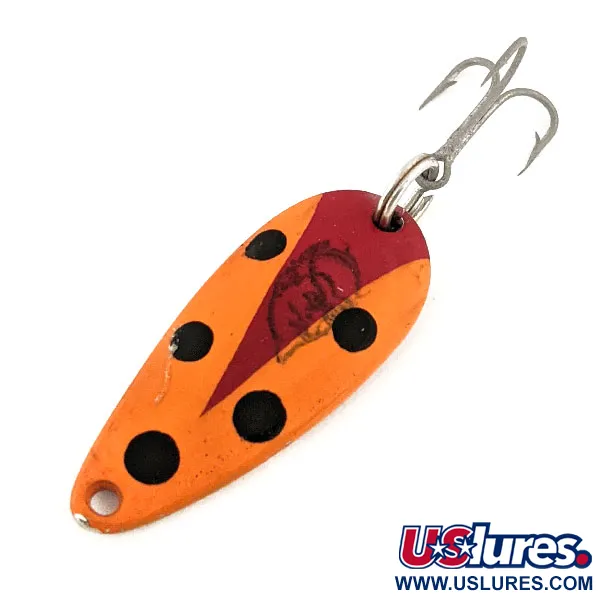 Un poids de 6 g (3/16 oz) fait de cette cuillère ondulante un choix polyvalent pour le lancer léger ou la traîne. La face avant est finie avec un émail orange vif, accentué par cinq points noirs et un chevron diagonal rouge foncé distinctif. Au centre de la partie rouge se trouve le logo classique de la tête de diable Eppinger, symbole du patrimoine de l'entreprise du Michigan depuis 1906. Mesurant 3,5 cm (1 1/2 pouce) de long, la cuillère possède un dos en nickel poli clairement estampillé "DARDEVLE MIDGET U.S.A.". Cet article, identifié par le code produit 12829, est en excellent état, noté 5/5 pour sa peinture bien conservée et son armement d'origine. Le montage comprend un anneau brisé standard à l'arrière associé à un hameçon triple piquant, conservant la configuration d'usine. Chaque courbe du métal est façonnée par des matrices exclusives qui définissent la gamme Eppinger depuis des générations.