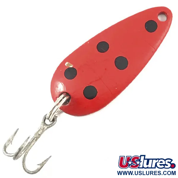 Cinq points noirs sont disposés de manière frappante sur la face rouge vif de cette cuillère de 6 g (3/16 oz). En retournant le corps métallique de 3,5 cm (1 1/2"), on découvre l'inscription « DARDEVLE MIDGET U.S.A. » profondément gravée dans le dos en laiton, reflétant le contrôle qualité maintenu par Eppinger depuis le transfert de ses activités à Dearborn en 1959. Ce spécimen particulier, répertorié sous le code produit 3860, conserve son fini brillant et est équipé d'un anneau brisé robuste et d'un hameçon triple. Le dos de couleur laiton est un élément de conception judicieux pour la pêche en eaux troubles, offrant un éclat différent de celui des modèles argentés. En ce qui concerne son état physique, le leurre présente des signes d'utilisation très minimes et est classé 5/5.