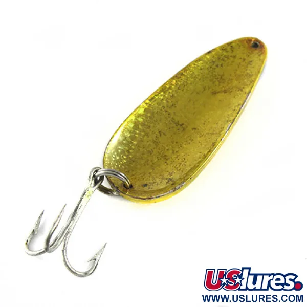 Des textures dorées martelées scintillent à la surface de ce spécimen vintage, mettant en valeur le motif de couleur classique Crystal Golden Crystal. Mesurant 7 cm (2 3/4") de long et pesant un solide 36 g (1 1/4 oz), ce Dardevle Rok't Devle est conçu pour la distance de lancer et la profondeur. Eppinger produit ces cuillers depuis 1906, utilisant des matrices exclusives pour créer le profil concave emblématique qui en a fait un incontournable des boîtes à pêche du Michigan et même des kits de survie militaires. Cette cuiller particulière, répertoriée sous le code produit 0651, est frappée de la marque "ROK'T" sur sa face. La finition métallique montre de légers signes de son vécu avec quelques petites taches sombres, tout en conservant un bel éclat qui lui vaut une note de condition de 4/5. Elle est équipée d'un grand hameçon triple argenté d'origine fixé par un anneau brisé robuste, et présente un œillet unique à l'extrémité effilée.