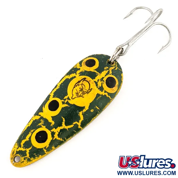 Une finition craquelée « Frog » verte et jaune caractérise cette cuillère de 7 cm (2 3/4"), qui présente quatre anneaux jaunes aux centres noirs entourant un disque jaune central. Ce disque central arbore le logo emblématique de la tête de diable Eppinger, gage de qualité issu des racines de l'entreprise à Detroit et Dearborn, au Michigan. Le revers du leurre révèle une surface argentée polie et propre, frappée des mentions ROK'T-DEVLE, IMP et U.S.A. Pesant 21 g (3/4 oz), ce modèle est conçu pour le lancer dans des conditions variées où un profil plus lourd est bénéfique. L'armement se compose d'un hameçon triple substantiel fixé par un anneau brisé robuste à la queue. Cet article est dans un état 5/5, paraissant remarquablement bien conservé avec une peinture vibrante et des marquages nets au dos. Le code produit spécifique de cette pièce vintage est 12704.