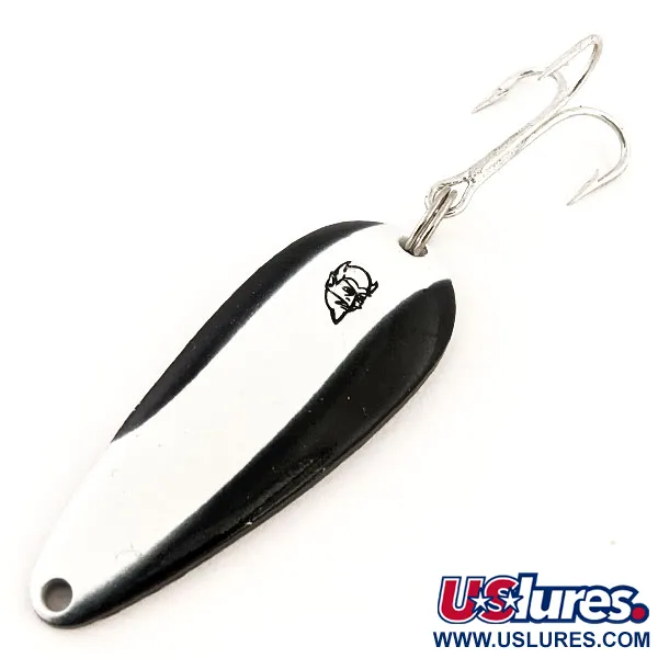 Les marquages estampillés sur le dos en laiton, notamment « Rok't-Devle Imp » et « Dearborn, MI », retracent l'histoire de cette cuiller de 21 g (3/4 oz) à la période suivant le déménagement du fabricant en 1959. Mesurant 5,5 cm (2 1/4"), le leurre présente une face noire et blanche à fort contraste avec le logo classique de tête de diable centré sur la partie blanche. Ce classique de chez Eppinger, code produit 13066, utilise une forme concave et oblongue destinée à créer une nage vacillante lors d'une récupération lente. Un triple brillant est fixé à la queue par un anneau brisé solide, ne montrant aucun signe de corrosion. L'état est de 5/5, la peinture et le dos en laiton paraissant très propres et bien entretenus. Alors que le devant noir et blanc offre une grande visibilité pour les carnassiers, le dos en laiton offre l'éclat traditionnel qui capture des poissons depuis que Lou Eppinger a fondé l'entreprise en 1906.