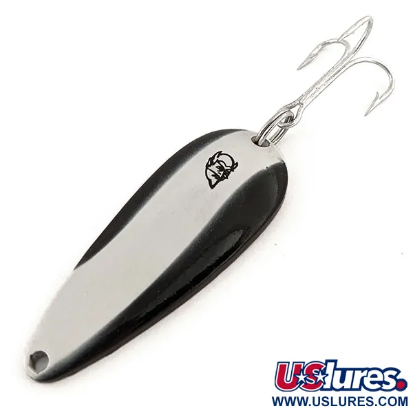 Le revers en laiton de cette cuillère porte l'estampille « ROK'T-DEVLE IMP. DEARBORN MICH. », identifiant sa fabrication après le déménagement d'Eppinger en 1959. Mesurant 5,5 cm (2 1/4") et pesant 21 g (3/4 oz), ce leurre présente une finition bicolore contrastée sur sa face ; une moitié est noire unie, tandis que l'autre est en argent métallique poli arborant le logo emblématique de la tête de diable noire. Cette disposition de couleur spécifique, associée au code 13136, est conçue pour le lancer et utilise une forme classique de goutte d'eau concave pour jouer avec la résistance de l'eau. Cet exemplaire est neuf et reste en excellent état, avec une note de 5/5. La peinture est nette et le dos en laiton présente une finition métallique d'origine propre, sans aucun signe d'utilisation. Il est monté avec un grand hameçon triple relié par un anneau brisé robuste. Depuis que Lou Eppinger a commencé à les fabriquer à la main à Detroit en 1906, les matrices exclusives de la gamme Dardevle ont conservé une géométrie spécifique que les collectionneurs reconnaissent immédiatement. C'est un exemple bien conservé de l'histoire du matériel de pêche américain provenant de l'usine de Dearborn, Michigan.
