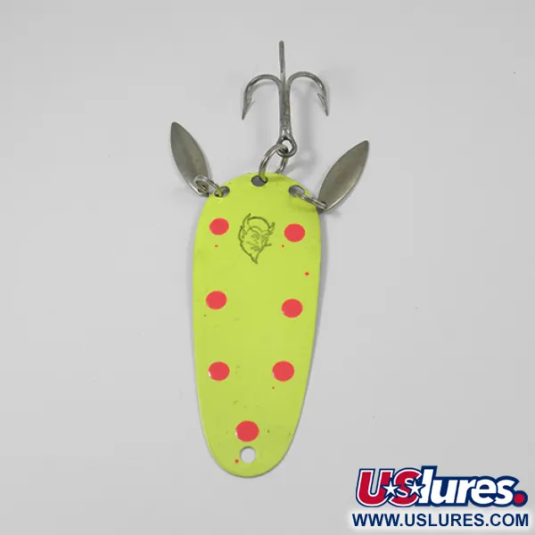 Une peinture chartreuse-jaune éclatante avec de gros points rouges recouvre la face de cette cuillère Eppinger de 8,5 cm. Répertorié sous le code produit 2016, cet exemplaire est dans un état exceptionnel (5/5), conservant sa finition brillante et ses marquages nets. Ce modèle Dardevle Sagamore JT Buel présente un montage spécifique à l'arrière où deux petites palettes argentées sont montées à côté de l'hameçon triple, ajoutant un éclat métallique significatif à son poids de 12 g. Au verso, le placage en nickel est clairement marqué du nom Sagamore JT Buel et de « Detroit, U.S.A. », faisant référence à la lignée historique et aux racines de fabrication dans le Michigan. Le logo emblématique à tête de diable est centré sur le côté peint, l'identifiant comme une pièce authentique du catalogue Eppinger.