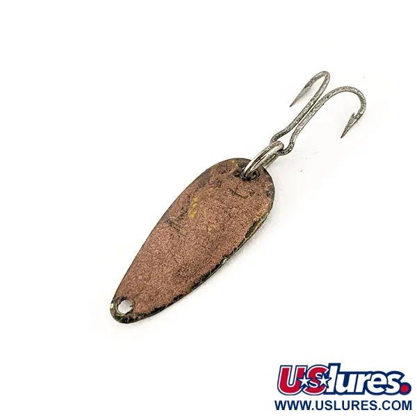 Avec un poids de seulement 1/32 oz (1 g), cette minuscule cuillère ondulante est un excellent choix pour les passionnés de matériel ultra-léger. La face avant présente une finition Bronze (laiton) chaleureuse, tandis que le verso offre une surface en nickel poli où le nom « DARDEVLE SKEETER » est clairement estampillé. Mesurant 2,3 cm (1"), ce modèle arbore la forme oblongue emblématique qui est une marque de fabrique d'Eppinger depuis les débuts de l'entreprise à Détroit. L'armement comprend un petit hameçon triple de style original relié par un anneau brisé robuste à l'arrière. Compte tenu de son âge, son état est noté 4/5, montrant de légères traces du temps sur les surfaces métalliques qui confirment son statut vintage. Ce modèle, identifié par le code produit 12415, a été fabriqué aux États-Unis à l'aide des matrices exclusives qui font la renommée de la société de Lou Eppinger. Sa conception concave est spécifiquement étudiée pour offrir une nage distincte sans nécessiter de montage complexe.