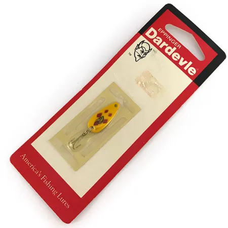 Une peinture jaune accentuée par des losanges rouges éclatants caractérise la finition iconique « Five of Diamonds » de cette petite cuillère ondulante de 2 g (1/16 oz). Identifiée par le code produit 7581, cette Eppinger Dardevle Skeeter mesure 2,3 cm (1"), conçue spécifiquement pour le lancer léger ou le jigging vertical pour les crapets et la truite. L'exemplaire est présenté dans son emballage d'origine intact, confirmant que le leurre est neuf. Au verso, l'adresse d'Eppinger Mfg Co. à Dearborn, Michigan, constitue un ancrage historique, l'entreprise s'y étant installée en 1959 pour poursuivre sa tradition de fabrication américaine. Le carton conserve également le marquage vintage « America’s Fishing Lures » et le logo distinctif à tête de diable qui est la marque de fabrique des designs de Lou Eppinger depuis plus d'un siècle. Un petit hameçon triple piquant est fixé via un anneau brisé robuste, prêt pour la pêche ou la collection. Ce leurre léger s'appuie sur son corps concave spécialisé pour créer sa présence signature dans l'eau lors d'une récupération lente et régulière.