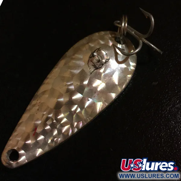 Une finition facettée « Crystal » définit cette cuillère Eppinger vintage, un motif dont la production a cessé dans les années 1980. Pesant 1/3 oz (9 g), cette Dardevle Spinnie Crystal (code produit 4408) est un exemple classique de l'artisanat américain des leurres de Dearborn, Michigan. Le corps en forme de goutte d'eau de 1 3/4" (4,5 cm) est frappé du logo emblématique à tête de diable, une marque d'authenticité recherchée par les collectionneurs sur ces modèles fabriqués aux États-Unis. La surface réfléchissante est conçue pour maximiser les éclats lumineux, utilisant les matrices exclusives qui ont fait la renommée d'Eppinger. Pour un leurre de cet âge, l'armement reste robuste, comprenant un anneau brisé solide et un hameçon triple piquant adapté au lancer ou à la traîne. Ce spécimen est dans un état 5/5, conservant un éclat propre et brillant sur toute sa surface texturée. Historiquement, ces petits modèles Spinnie ont été conçus pour la polyvalence, servant souvent de choix de prédilection pour la truite ou les poissons de friture lorsqu'un profil plus petit était nécessaire. L'intérieur concave de la cuillère est poli pour une brillance élevée, contrastant avec l'extérieur multi-angle qui capte la lumière de toutes les directions.