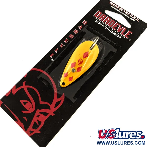 Cinq losanges rouges se détachent sur une finition jaune vif sur la face convexe de cette Eppinger Dardevle Spinnie Weedless. Répertorié sous le code produit 20297, ce leurre de 7 g (1/4 oz) mesure 4,5 cm (1 3/4") et arbore le célèbre motif « Five of Diamonds ». Sa conception anti-herbe intègre un hameçon simple protégé par un garde-fil, conçu pour prospecter les obstacles et les herbiers où se postent souvent le black-bass, la truite ou les poissons de friture. Fabriqué avec un dos en laiton, ce modèle est produit aux États-Unis à l'aide des matrices exclusives d'Eppinger. Le leurre n'a jamais été utilisé et repose toujours dans son emballage d'origine noir et rouge, lequel affiche la référence d'usine 9517. Ce modèle perpétue l'héritage de la marque Eppinger, qui a transféré sa production à Dearborn, dans le Michigan, en 1959. Le logo classique à tête de diable sur la cartonnette témoigne d'une histoire de fabrication de leurres débutée à Détroit en 1906.