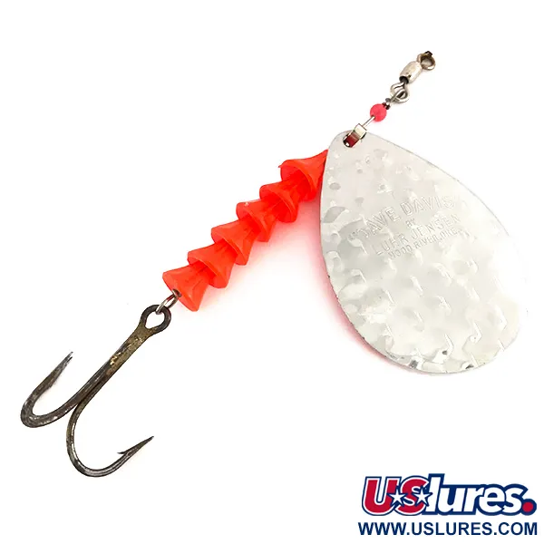 Les textures en nickel martelé sur la palette en forme de goutte offrent une surface réfléchissante classique qui définit ce spécimen Luhr Jensen. Mesurant 13 cm (5") et pesant 17 g (3/5 oz), cette cuillère tournante de traîne Dave Davis UV, identifiée par le code produit 7673, intègre une série de cinq perles en plastique coniques dans un ton orange-rose fluorescent. Ces perles sont conçues pour réagir à la lumière ultraviolette, rendant le montage visible dans les couches d'eau plus profondes ou par temps couvert. L'envers de la palette présente une finition orange mat solide, offrant un contraste distinct avec l'avant métallique brillant. À l'extrémité, un hameçon triple à finition sombre est fixé via une boucle métallique, tandis que l'extrémité avant dispose d'un émerillon baril pour faciliter la rotation pendant la traîne. Noté 4/5, le leurre présente une peinture bien conservée et des parties métalliques brillantes issues de son époque de fabrication américaine.