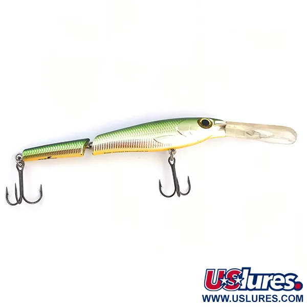 Un dos vert vif se transforme en motifs d'écailles argentées sur ce leurre articulé, qui présente un ventre jaune prononcé et un logo « STORM » gravé près de l'attache du crochet arrière. Répertorié sous le code 4942, ce Deep Jointed Minnow Stick 14 mesure 14 cm (5 1/2") et pèse 25 g (1 oz). La conception du corps en deux sections est associée à une grande bavette transparente conçue pour atteindre des profondeurs allant jusqu'à 5,6 m (18,4 ft), bien qu'il évolue généralement entre 1,5 m (5 ft) et 3 m (10 ft) lors du lancer. Son armement se compose de deux hameçons triples robustes fixés par des anneaux brisés renforcés. De grands yeux dorés aux pupilles sombres constituent un point focal sur la tête, qui présente également des détails de ouïes moulés. Ce spécimen est dans un état 5/5, conservant une finition impeccable. Un système de billes interne offre un profil acoustique bruyant lors de ses déplacements dans la couche d'eau.
