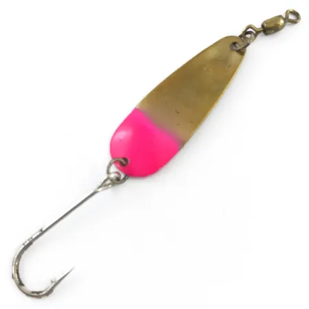 Un poids de 1,7 g (1/16 oz) confère à ce Dick Nite #2 le profil idéal pour des présentations délicates en eaux claires. Mesurant 3,5 cm (1 1/2") de long, cette cuillère présente une finition bicolore Or / Rouge, la partie rouge affichant une qualité fluorescente éclatante qui ressort sur la base métallique. Le nom de la marque est clairement frappé sur le métal doré, identifiant son origine auprès de la société Dick Nite Spoons aux USA. Ce spécimen particulier, identifié par le code produit 5314, est équipé de son émerillon baril en laiton d'origine et d'un hameçon simple à hampe longue. Avec une note d'état de 4/5, le leurre présente une surface propre et des composants bien entretenus. La faible épaisseur du métal utilisé reflète les techniques de fabrication traditionnelles de ces leurres, conçus spécifiquement pour une utilisation efficace à la traîne à faible vitesse.
