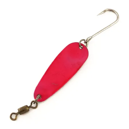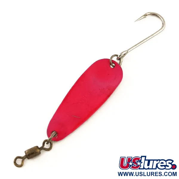 Mesurant 1 1/2" (3,5 cm) de long, cette cuillère est un élément fondamental pour tout collectionneur de matériel du Nord-Ouest Pacifique. Avec un poids plume de 1/16 oz (1,7 g), la Dick Nite #2 UV présente une finition Pink qui révèle un éclat intense sous la lumière ultraviolette, ce qui en fait un outil spécialisé pour les environnements à faible luminosité. Ce modèle, identifié par le code 11486, illustre la conception en métal de faible épaisseur qui fait la renommée de Dick Nite Spoons aux États-Unis depuis des décennies. L'armement se compose d'un hameçon simple et d'un émerillon monté à l'avant, tous deux maintenus en excellent état. Présentant une surface impeccable, son état est évalué à 5/5, avec un revêtement fluorescent qui reste vif et réactif à l'exposition aux UV.
