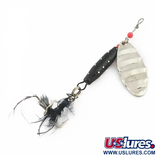 Lestée à 7g (1/4oz), cette cuillère tournante de fabrication japonaise présente un corps noir effilé orné de marbrures blanches. La palette à finition nickel possède une texture ondulée conçue pour capter la lumière sur ses 7 cm (2 3/4") de longueur. Identifiée par le code produit 24421, la Dolphin Marble illustre la fabrication japonaise typique du milieu du siècle, visible dans la construction simple par enroulement de fil et les perles rouges près de l'attache. L'hameçon triple est garni de plumes sombres, ajoutant un profil visuel souple derrière le corps lesté aux motifs marbrés. Ce spécimen particulier montre son âge à travers son histoire sur l'eau, reflétant un état de 1/5 avec une usure marquée par les sorties de pêche passées. Un petit étrier métallique permet à la palette ovale de tourner légèrement à l'écart du corps noir et blanc, conservant la silhouette classique des cuillères tournantes.