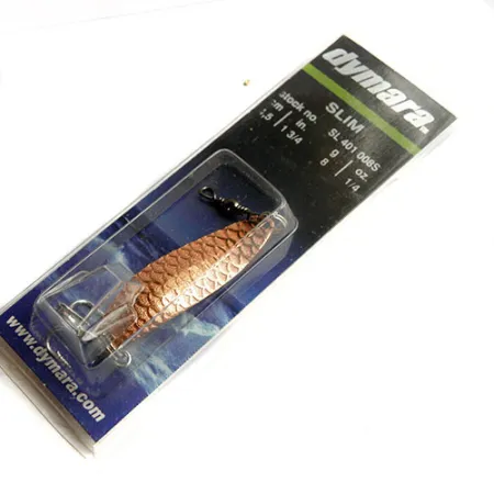 Des écailles de cuivre gravées dans la surface confèrent à cette cuiller ondulante canadienne effilée un profil visuel distinctif qui n'est plus en production. Pesant 1/4oz (8g) pour une longueur de 1 3/4" (4,5cm), ce modèle Dymara SLIM — identifié par le code produit 0837 et le numéro de stock SL 401 008S — a été conçu pour une grande polyvalence dans l'eau. La finition est d'une teinte profonde Copper / Orange, conçue pour produire un éclat constant lors du lancer ou de la traîne. Ce spécimen reste inutilisé dans son emballage d'origine, avec une note de condition de 6. Un émerillon baril noir est pré-monté sur l'œillet, une caractéristique standard des cuillers Dymara de cette époque destinée à minimiser le vrillage de la ligne. Le support en carton reflète l'histoire de la marque au Canada, avec des spécifications en double unité pour les marchés domestique et international.
