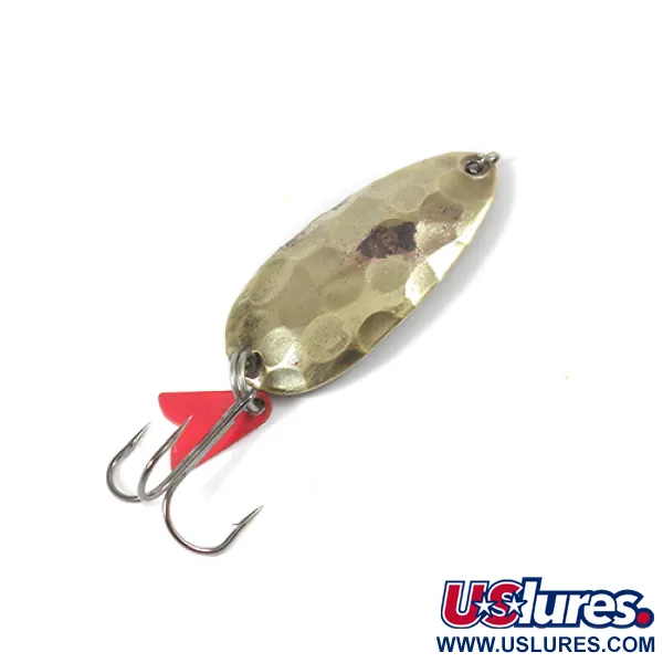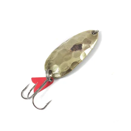 Martelée à la main à partir de laiton de haute qualité, la surface bosselée de cette cuillère de fabrication suisse illustre les techniques de fabrication artisanales qui étaient autrefois la norme pour la marque EGB. Mesurant 4,5 cm (1 3/4") pour un poids de 9,5 g (1/3 oz), le leurre présente une finition laiton avec des marques de martelage individuelles qui créent une surface réfléchissante aux multiples facettes. Le revers est clairement marqué du poinçon « EGB SWISS MADE », identifiant son origine et sa qualité auprès des collectionneurs chevronnés. Ce leurre spécifique, code produit 2100, est équipé d'un hameçon triple piquant et du classique aileron attracteur en plastique rouge fixé via l'anneau brisé arrière. Son état est noté 4/5, présentant de légères marques de surface tout en restant propre et bien conservé. Chaque coup de marteau de l'artisan utilisé pour façonner ce corps en laiton garantissait qu'aucune cuillère n'était exactement identique à une autre.