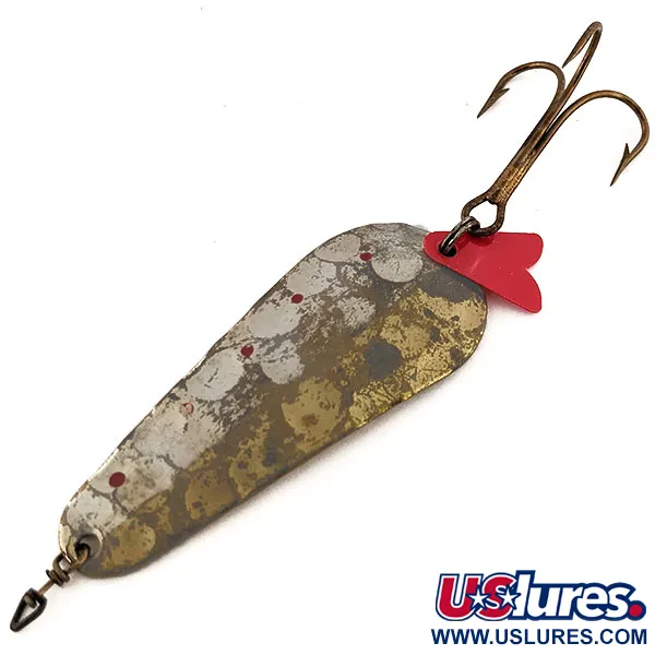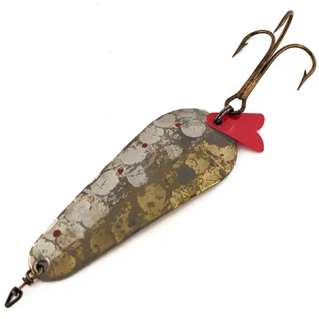 Des empreintes martelées à la main sur le corps en laiton révèlent le savoir-faire artisanal suisse derrière cette cuillère vintage. Pesant 14g (1/2oz) pour une longueur de 6cm (2 1/4"), ce leurre EGB Swiss made arbore une finition bicolore Or / Argent. La face avant est plaquée argent avec de petits points rouges, tandis que le revers présente la marque du fabricant estampillée sur le laiton. Un teaser en plastique rouge en forme de cœur est fixé à l'hameçon triple arrière, offrant un contraste visuel marqué. Ce spécimen, portant le code produit 12842, est en état 4/5, montrant une usure propre liée à son âge sur les surfaces métalliques. Un émerillon intégré est fixé à l'œillet avant, le rendant prêt pour diverses techniques de lancer ou de traîne. La texture martelée est un détail technique emblématique de la marque EGB, conçu pour refléter la lumière sous différents angles lors de l'utilisation.