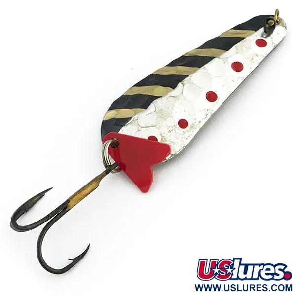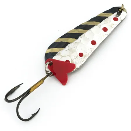 Les marques de martelage visibles sur toute la surface témoignent du processus artisanal utilisé par EGB en Suisse pour créer cette cuillère de 14g. Estampillé clairement sur le dos en laiton, la marque du fabricant et « SWISS MADE » attestent de la qualité de ce leurre argenté. Mesurant 6 cm, l'avant présente un motif unique de rayures diagonales brunes et dorées sur un fond argenté martelé, ponctué de cinq points rouges vifs. Ce modèle spécifique, répertorié sous le code produit 8881, comporte un trailer classique en plastique rouge en forme de cœur attaché à l'anneau brisé de l'hameçon triple, destiné au lancer ou à la traîne. L'hameçon triple reste piquant avec une hampe distinctive de couleur laiton. Noté 5/5, le leurre présente une finition exceptionnellement propre, sans usure du placage d'argent ou des détails peints. Les collectionneurs apprécieront le savoir-faire manuel évident dans le martelage légèrement irrégulier qui garantit qu'aucune de ces cuillères à âme en laiton n'est exactement identique.