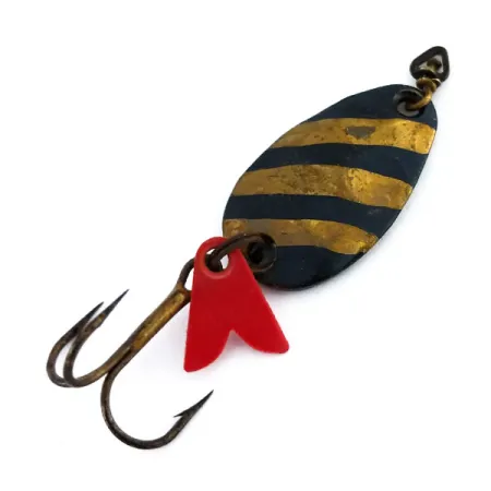 Une structure en laiton constitue la base de cette authentique cuillère EGB Swiss-made, mesurant 2,5 cm (1"). Un côté du métal présente un motif frappant de rayures alternées noires et dorées, tandis que le revers affiche le poinçon authentique « EGB SWISS MADE » clairement frappé dans la surface texturée. Pesant 3 g (3/32 oz), ce modèle est équipé de son triple d'origine et d'un trailer en plastique rouge caractéristique fixé à l'anneau brisé arrière. Ces leurres étaient historiquement réputés pour la qualité de leurs matériaux, chaque exemplaire étant martelé à la main pour créer les fossettes de surface spécifiques visibles sur le laiton. Identifié par le code produit 9753, le leurre conserve un aspect propre avec un accastillage bien préservé, obtenant une note d'état de 4/5. L'assemblage supérieur comprend un petit œillet pivotant, typique de la fabrication de précision attendue des ateliers de pêche suisses de cette époque.
