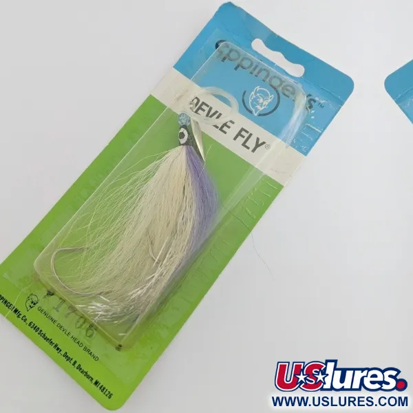 Le bucktail violet et blanc constitue le profil visuel principal de ce montage de traîne spécialisé, un concept hybride entre une cuillère traditionnelle et une mouche. Produit par Lou J. Eppinger Mfg. Co. à Dearborn, Michigan, le Devle Fly utilise une pale métallique tournant librement sur un axe pour générer des flashs lumineux lors de la traction. Ce modèle, portant le code produit 24438, présente une pale finition nickel associée à un hameçon habillé de blanc et de violet. Il est conçu pour la traîne profonde, souvent utilisé avec un flasher ou un attracteur pour cibler la truite grise et d'autres salmonidés. Conservé dans son emballage d'origine en carton vert et bleu, ce leurre est neuf (état 6). L'ensemble comprend un hameçon simple intégré au bucktail pour maintenir un profil profilé pendant la nage. Un détail d'œil peint sur la partie en plomb de la mouche offre un point d'attaque précis situé derrière la pale rotative en nickel.