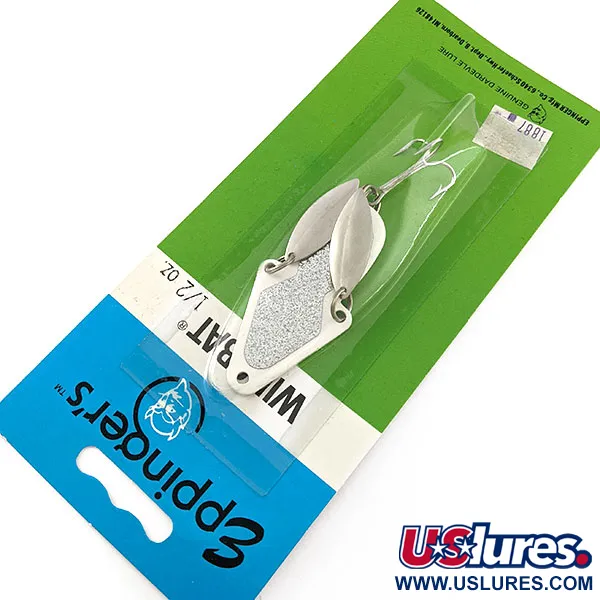 Une peinture blanche associée à un insert texturé de paillettes argentées définit le profil visuel remarquable de ce modèle. Produit par Eppinger, ce modèle Wingbat mesure 6 cm (2 1/4") et pèse 14 g (1/2 oz). Sa conception présente des « ailes » latérales distinctives et un corps concave, témoignant de l'accastillage spécialisé issu des modèles originaux de Lou Eppinger de 1906. Identifié par le code produit 22723, ce leurre est présenté sur son emballage d'origine vert et bleu. Cet exemplaire n'a jamais été utilisé, conservant une finition impeccable sur le corps blanc et la surface pailletée réfléchissante. Tout l'armement d'origine, y compris l'hameçon triple, reste intact et solidement fixé. Le contraste entre la finition blanche unie et le centre argenté pailleté offre une grande visibilité, une caractéristique qui a fait d'Eppinger un incontournable des boîtes de pêche, même après son déménagement à Dearborn en 1959. Le carton reste propre et la bulle plastique est intacte, préservant l'état d'origine du leurre.