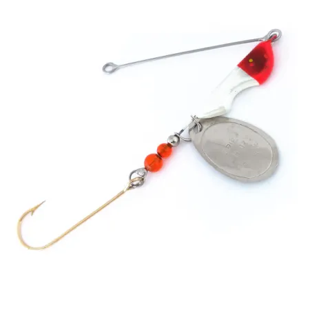 Pesant 1/2 oz (14 g), ce spinnerbait à lest avant (weight-forward) reprend le design classique du lac Érié popularisé par le capitaine Dan Galbincea. La palette nickelée est associée à deux perles orange vif situées juste devant l'hameçon doré à tige longue. Cet Erie Dearie Walleye Killer spécifique, identifié par le code produit 10872, présente une section de corps rouge et blanche distinctive montée solidement sur l'armature métallique. Mesurant 10 cm (4") de longueur totale, ce leurre fabriqué aux États-Unis est conçu pour la technique du « count-down » utilisée pour atteindre les dorés postés à des profondeurs spécifiques. L'armature présente une finition propre et bien conservée, ce qui lui vaut une note de condition de 5/5. Sa tige métallique est droite, se terminant par une boucle d'attache parfaitement formée pour une nage stable lors d'une récupération lente ou d'une dérive.