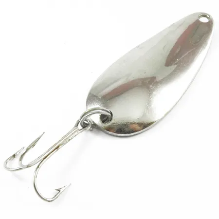 Le nom « EVANS » est clairement estampillé sur la face concave du métal, identifiant cette cuillère de 2 1/2" (6,5 cm) comme une pièce classique de l'histoire du matériel de pêche américain de Glen Evans. Pesant 3/4 oz (21 g), le leurre bénéficie d'une finition Rainbow Nickel brillante offrant une réflectivité importante pour diverses clartés d'eau. Ce spécimen, portant le code produit 3247, est conservé dans un état 4/5, présentant une surface bien entretenue qui souligne sa géométrie en forme de goutte d'eau. L'armement comprend un grand hameçon triple attaché via un anneau brisé solide, conçu pour les rigueurs des lancers lourds et de la récupération. Un trou percé avec précision en tête fournit un point d'attache sûr pour une agrafe ou un bas de ligne. Le marquage estampé à l'intérieur du creux de la cuillère reste net et lisible, reflétant les standards industriels de sa fabrication aux États-Unis.